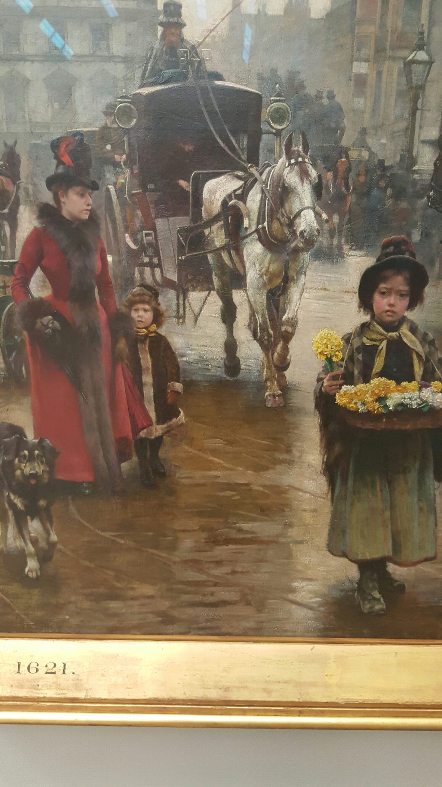 I took a closer look at the painting and it depicted a scene of a poor girl selling flowers. In the background there is a woman looking on, maybe wanting to buy some flowers. Behind the woman is a small girl, not much younger than the other selling flowers.